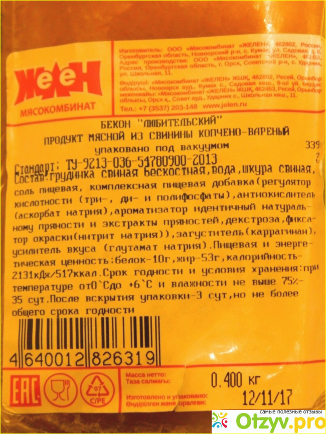 Мой вывод: бекон "Любительский" Орского мясокомбината "ЖеЛен" стоит иногда покупать, чтобы разнообразить семейное меню в периоды острого цейтнота. Цена у продукта доступная: 400-граммовая упаковка стоит 180 рублей.