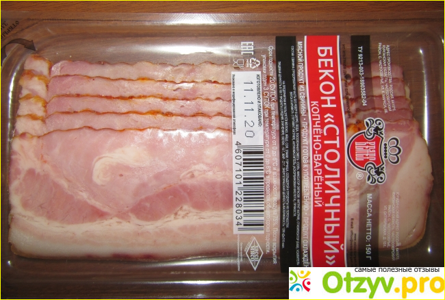 Бекон "Столичный" копчено-вареный от мясокомбината "Велес" - вкусная мясная нарезка как на стол в праздник, так и для повседневного употребления.