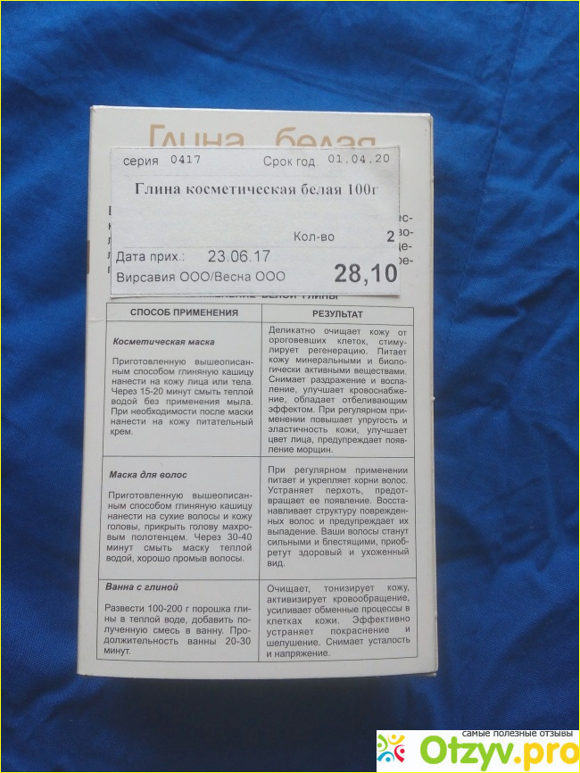 Все эти положительные действия на кожу можно увидеть уже после первого ее применения. А также белая глина мягко осветляет пигментацию и веснушки.