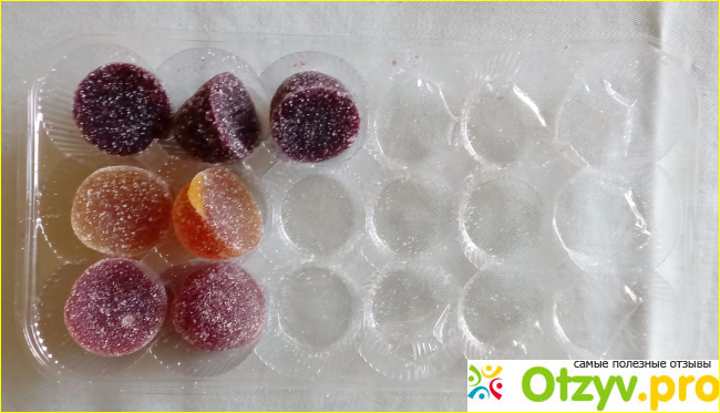 Вкус у мармелада отличный, кисло-сладкий с тонким ароматом яблока в одном, клюквы – в другом и смородины – в третьем варианте лакомства. Мармелад плотный – чувствуется, что пектина много. А пектин – вещь суперполезная! Так что рекомендую. И сама буду покупать, хотя цена не копеечная: 514 рублей за коробку весом 560 г.
