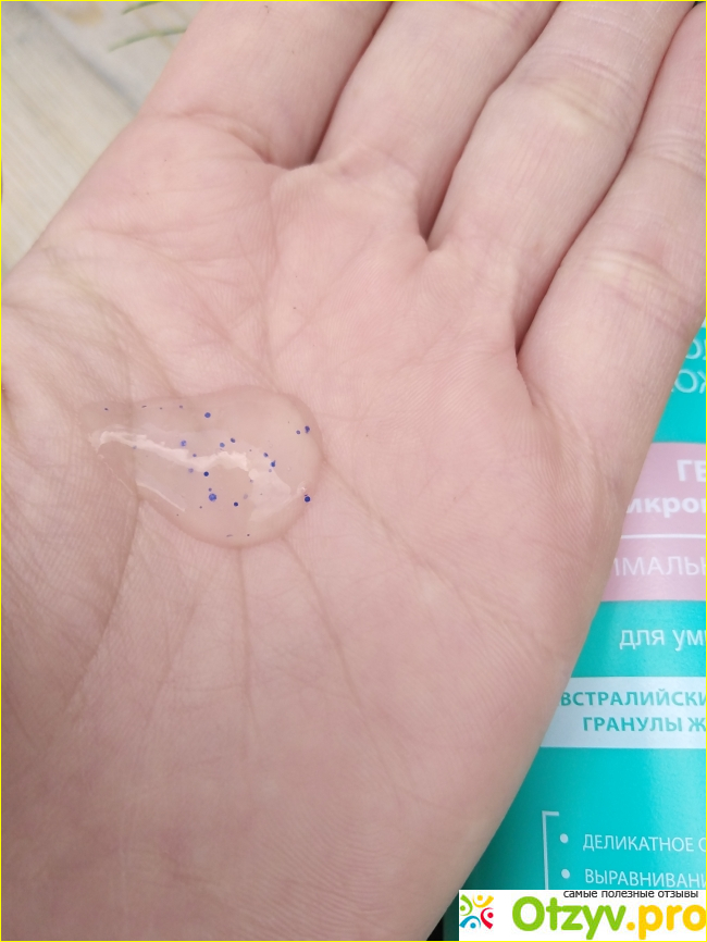 Очень удобный колпачок. Гель представляет собой плотную прозрачную, не очень консистенцию с небольшими голубыми гранулами.