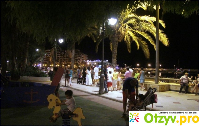 В ночное время весь народ перемещается с пляжей в кафе и на променады, часто можно услышать живую музыку. При отеле были и аниматоры, говорили на испанском или английском. Интернетом здесь не пользовались, так как он платный, 2 евро в час и только в номере. С едой полный порядок, большое обилие фруктов, очень свежих и вкусных, шикарная гаспачо, часто подают мясо, а вот почему-то с рыбными блюдами здесь было не богато, но нас это не расстроило больше налегали на мясо и фрукты).
