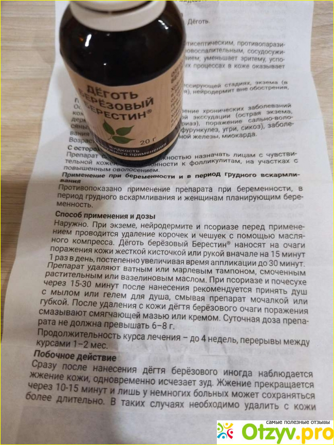 Спустя это время, смываю деготь водой. Деготь хорошо успокаивает кожу, снимает воспаление и зуд. Средство однозначно могу рекомендовать.