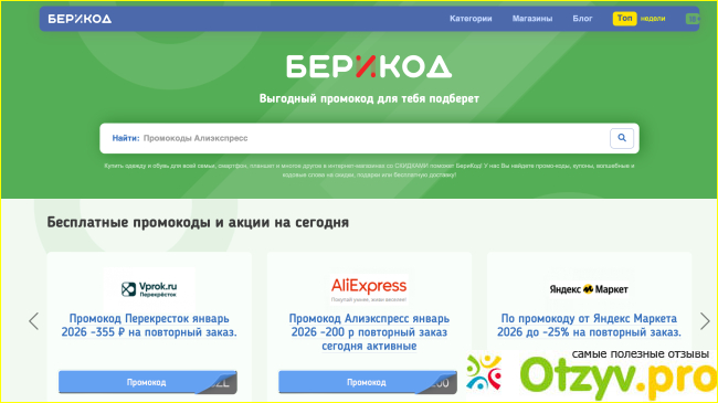 Давно пользуюсь данным бесплатным сервисом по поиску бесплатных промокодов БериКод. ру! Удобно реализован поиск категориям магазинов, по самим магазинам ( названию) или по отдельным словам к примеру "Скидки на кофемашины" выдал все найденные промокоды сразу. Хорошо помогает блог, где расписаны лайфхаки по экономии и часто бывают эксклюзивные промокоды на скидку.