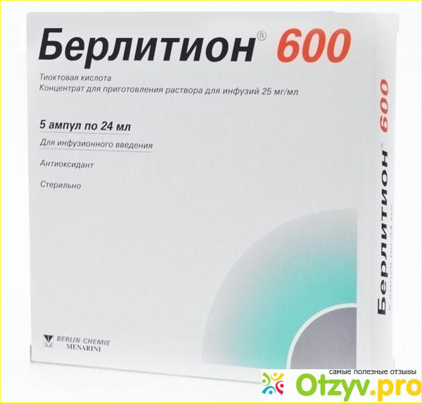 «Берлитион» - это антиоксидант, который регулирует в организме углеводный и липидный обмен. Данное средство продается в виде концентрата для инфузий. Основным действующим компонентом является тиоктовая кислота. В одном миллилитре тиоктовой кислоты содержится двадцать пять миллиграммов, а в одной ампуле — шестьсот миллиграммов.