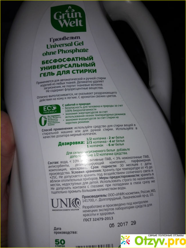 Мне очень понравился состав у этого геля – нет фосфатов и фосфонатов (вообще никаких продуктов нефтехимии), нет оптических отбеливателей, энзимов и, конечно же, хлора. ПАВ тут не на натуральной основе, но их количество минимально и поэтому никакого вреда они не представляют. Красителей и едкого запаха в геле grunwelt тоже нет. Это средство называется эко, потому что оно безопасно не только для людей, но и не вредит экологии, оно полностью биоразлагается в природе.