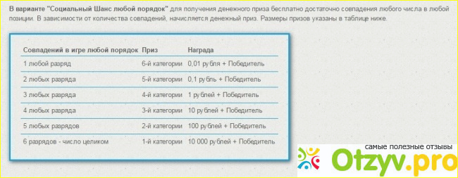 При совпадении одной из шести цифр выигрыш составляет одну копеечку, если совпадает две цифры, то десять копеек, если три цифры, то рубль, четыре цифры - 10 рублей, пять - 100 рублей, и так дальше.
