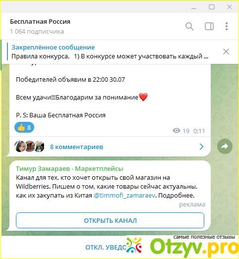 Телеграмм канал Бесплатная Россия простенький в оформлении, пока молодой не раскрученный. Попала на него случайно, выполняя задания по накрутке в вк серфинг. Честно еще не выигрывала, победитель сразу отписывается о получении выигрыша. Может и мне повезет. Ставлю тройку каналу за неподтвержденность выплат (я еще не выиграла не знаю платят ли) и слабое оформление канала.