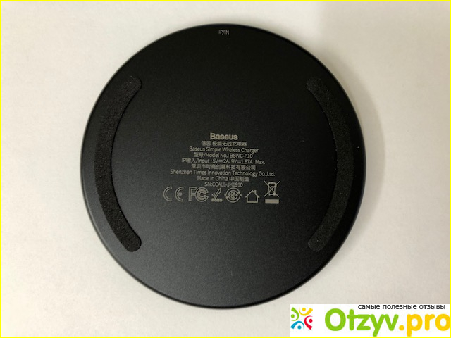 Зарядник представляет собой тонкий круглый диск, лицевая поверхность глянцевая.