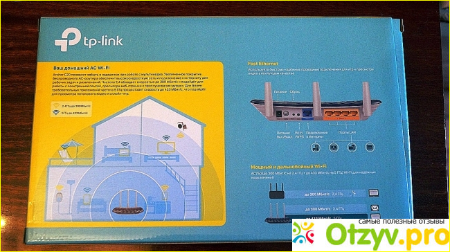Данный маршрутизатор продается в плотной и красивой картонной упаковке, на которой имеются надписи, что он имеет два диапазона Wi-Fi до 300 Мбит/с + 433 Мбит/с с отличным покрытием и с простой настройкой.