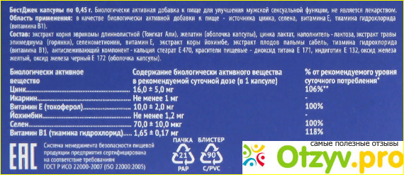 Изучив инструкции к препарату БестДжек мы узнали, что препарат относится к БАДам и в основном состоит из растительных компонентов (корень эврикомы, горянка, плоды пальмы сабаль и кора йохимбе) и витаминов и микроэлементов (цинк, кальций, токоферол, тиамин, лактоза).