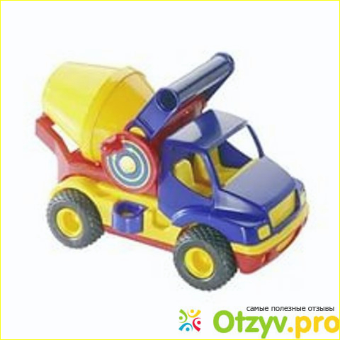 Игрушка изготовлена из качественного и прочного пластика. Если малыш еще маленький, наверху машинки расположилась удобная ручка для переноски бетономешалки.