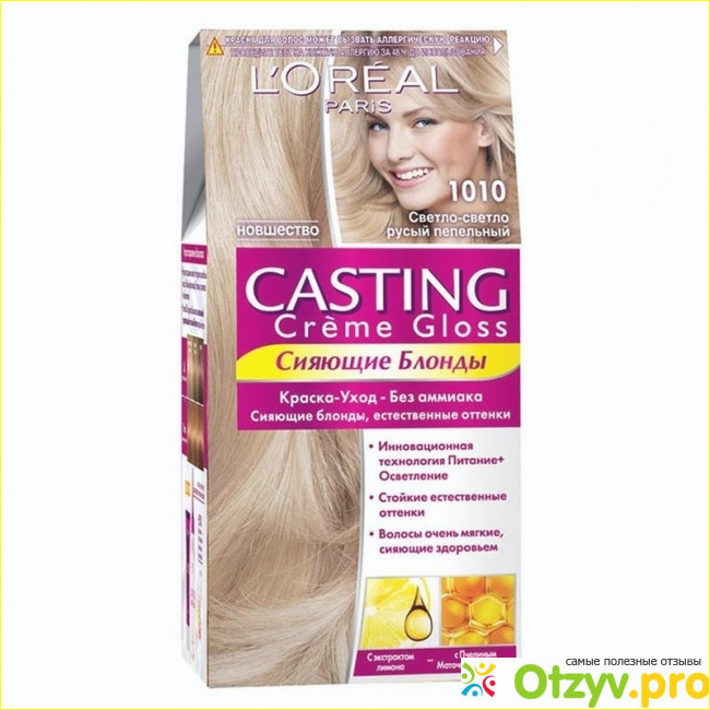 Краска Casting Cremt Gloss. Производитель обещает прекрасный блеск, естественные оттенки, благодаря особой формуле. По отзывам пользователей, она не закрашивает седые волосы, смывается в течение месяца. Желательно дополнительно покупать уход после окрашивания этого же производителя.