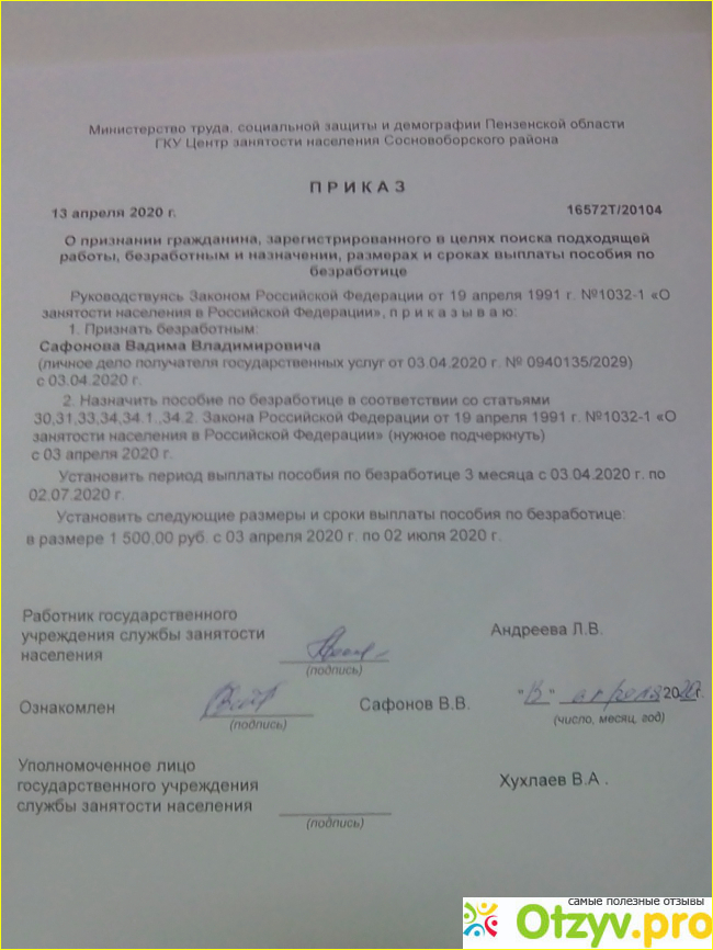 Приказ ГЦЗН Сосновоборского района о признании меня безработным в законном порядке , которым мне на месяц проживания определяется сумма, выживания в размере 1500 рублей? Это что? Шутка или прямой геноцид, обрекающий меня на голодную смерть? И это еще начало сказочных преступлений, в отношении отдельно взятого гражданина Великой и щедрой России. Аргументом такой суммы пособия в словах сотрудников ГЦЗН Пензенской области, послужил тот факт что я не предоставил им справок о доходах за предидущие 3 месяца. А сколько нас таких в России гнувших спины на неофициальных работах, по тем или иным причинам, зачастую создаваемые самими органами самоуправления, в отдаленных областях и районах Страны за сущие копейки (12000-20000) рублей? И теперь наши чиновники посадят нас на 1500рублей-ГОЛОДНУЮ СМЕРТЬ! А по телевизорам вновь будут говорить о справедливости.