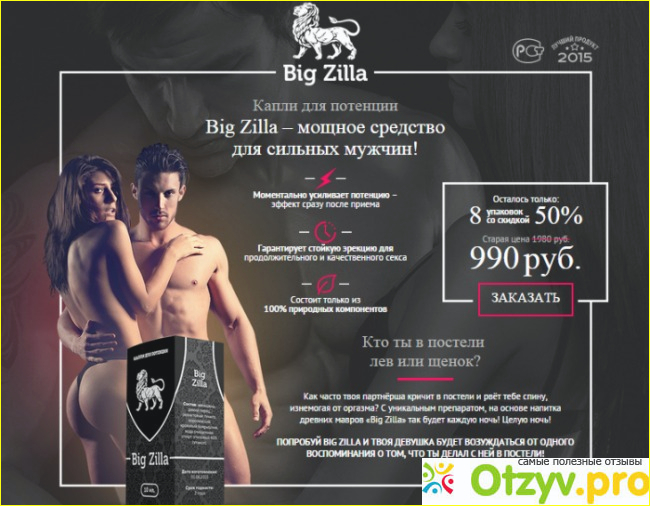 Сильных проблем в постели у нас с мужем не было. То есть он у меня не импотент, и не скорострел (думаю, все знают, что подразумевает это обидное слово), однако с возрастом стало у нас все как-то тихо, редко и неинтересно. Почитала я литературу: оказывается, у большинства пар после десяти лет совместной жизни страсть начинает постепенно затухать, кто- о мирится с таким положением дел, кто-то заводит романы на стороне, а кто-то дает своим чувствам второе дыхание, стимулируя отношения правильными средствами. Считайте, что это такие витамины для любви, а не капли Big Zilla, тем более, что они действительно возвращают настоящую любовь. Эффект ощущается где-то на третий-пятый день применения капель: возникает стойкое желание, эрекция становится просто каменной, половой акт длится дольше, ощущения ярче, чувствительность острее.