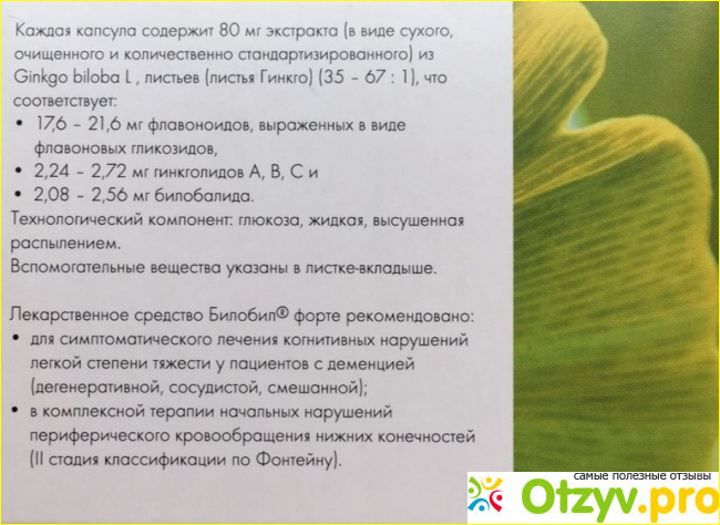 Выпускается Билобил в двух вариантах, в простой и в усиленной форме. В последнем случае он имеет приставку "форте". В этом усиленном варианте содержится сухого экстракта листьев гинкго билоба 80 миллиграмм. Это и является основным действующим веществом. Стоит упаковка в нашей аптеке с 20 капсулами 375 рублей. Мне сказали, что бывают, но редко упаковки по 60 капсул, они гораздо выгоднее при приобретении. Но что было в настоящий момент, то и взяла.