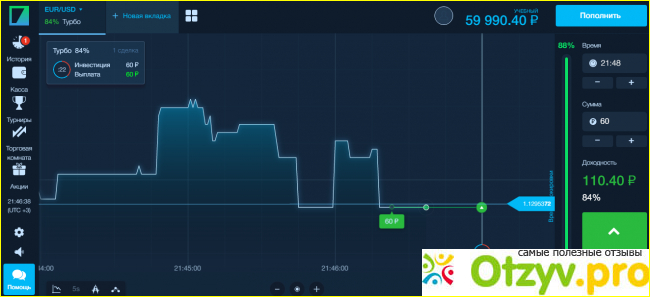 Минимальная сумма сделки тоже вполне себе бюджетна и доступна для рядового игрока: минимальная ставка составит всего 60 рублей (меньше только у Олимп Трейда, там вообще 35 рублей). То есть, веду разговор о том, что любой простой человек вполне может попробовать поиграть на бинарных опционах, не внося больших денег и не рискуя ими.