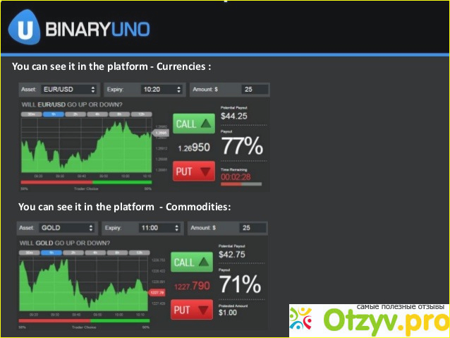 Если вы ищите надежную интернет площадку для торговли бинарными опционами, хочу порекомендовать всем www.binaryuno.com. Этот брокер доказал, что не ведет никаких мошеннических действий и всегда выплачивает заработанные деньги. Даже если вы только начинаете свой путь в торговле, то на этом сайте вы сможете получить всю необходимую информацию и пройти обучение. В разделе интерактивная академия представлено много видео информации. Даже для тех, кто уже имеет базовые знания будет интересно изучить эту информацию. Лично я смог узнать кое что новое и сделать свой способ торговли еще более совершенным. Прямо на сайте есть анализ валют. Если вы сможете правильно оценить полученную информации, то и торговать будет намного проще и выгодней.