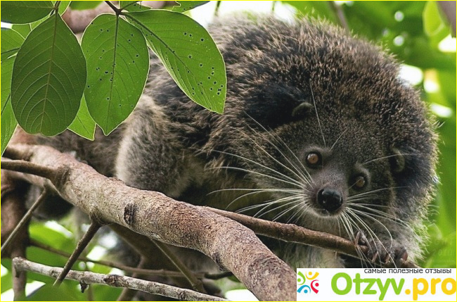 Бантуронгов называют кошачьими медведями за их странноватый внешний вид - неуклюжие движения напоминают "грацию" медведя, но стоит влезть такому животному на дерево - сразу угловатые и неуклюжие движения пропадают, на смену им приходят грацозные кошачью повадки.