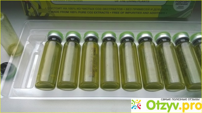 Внутри ампулы жидкий ароматный состав зеленого цвета.