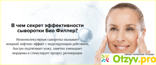 Уникальная низкомолекулярная сыворотка BIOFILLER дает приблизительно тот же эффект, что и уколы ботокса или круговая подтяжка лица, но при этом нет негативных побочных моментов. Да и применять наружный крем удобнее и дешевле. В числе положительных действий имеем:
