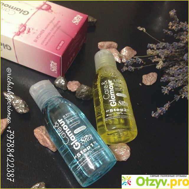 Комплекс биоламинированиея Shot Care & Glamour bi power keratin treatment состоит из средств в двух бутылочках, по цвету светло-желтого и голубого.