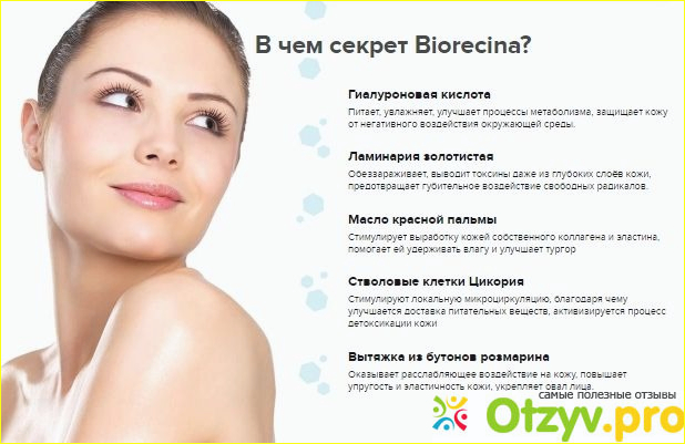 Биорецин – это специальный уникальный крем, который просто прекрасно заменяет ботокс и устраняет морщины за курс применения без опасности ухудшения здоровья. В этом креме совершенно нету вредных компонентов, кроме натуральных составляющих растительного происхождения и природного. Базовым преимуществом этого крема над другими способами омолаживания, становится восстановление поврежденных клеток. Инновационный коктейль полезных веществ способен воздействовать даже на области межбровных и носогубных складок. Содержащийся в составе антиоксидант ослабляет негативное воздействие свободных радикалов, что считается одним из основных причин старения покровов. Продукт был испробован женщинами из разных стран. Он пользуется востребованностью и среди известных представителей светской жизни. Помимо устранения морщин средство также делает кожу упругой, гладкой, молодой.