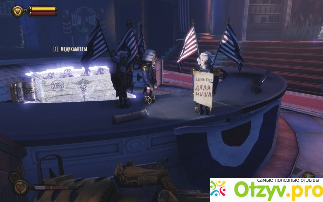 Интригующий сюжет, колоритные персонажи, запоминающиеся локации и фотографирование мутантов всех мастей, которые пытаются тебя уничтожить самыми разнообразными способами. Все эти аспекты игры надолго врезались в мою память и стали своего рода эталоном в жанре шутеров. Потом пришло время сиквела, который, если честно, не смог меня ни удивить, ни оставить хоть какой-то значимый след в моей памяти. Вроде всего больше, разнообразнее, а вот изюминки, к сожалению нет. Наконец пришло время триквела. Из глубин в небеса. Итак, начнем с плюсов. Новая возможность перемещения, рука-крюк, которая позволяет абсолютно по-новому взглянуть на локацию и серьезно увеличивает динамику боя на открытых пространствах. Оружие и умения тоже стали разнообразнее. Ну и конечно, помощница Элизабет, главный козырь этой игры, более живого и трогательного персонажа я еще не встречал. Она действительно помогает в сражениях и за ее эмоциями интересно следить, она является душой этого проекта и помогает закрыть глаза на некоторые недостатки этого проекта. Кстати о них. Основным, как мне кажется, является отсутствие разнообразия врагов. Всю игру мы уничтожаем одних и тех же людей, немного механизированных чудовищ, и опять люди. Тоже самое происходит и с оружием, выбираете себе парочку любимых стволов, тоников и вперед. По прошествии времени вы можете их улучшить, но вот пробовать что-то новое вряд ли станете. Зачем ломать то, что и так работает. Можно конечно и дальше разбирать эту игру на плюсы и минусы, но как-то не хочется, все-таки главное, чтобы после финальных титров, когда вы отодвигаетесь от стола и откидываетесь на спинку кресла, у вас было ощущение что время, было потрачено не впустую. Эта игра стоит того, чтобы ее пройти хотя бы раз, спасибо Элизабет.