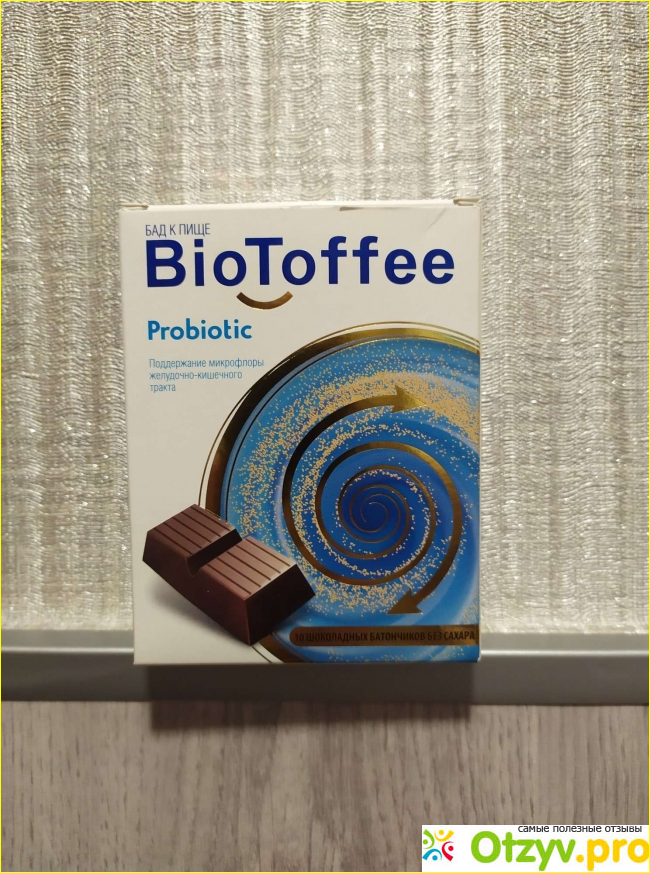 Врач посоветовала мне курс пробиотиков, в аптеке увидела Биотоффи – пробиотик в форме шоколадных батончиков. Спросила у фармацевта, что за средство, она сказала – появилось не так давно, но берут хорошо. Купила и я. Коробочка выглядит вот так: