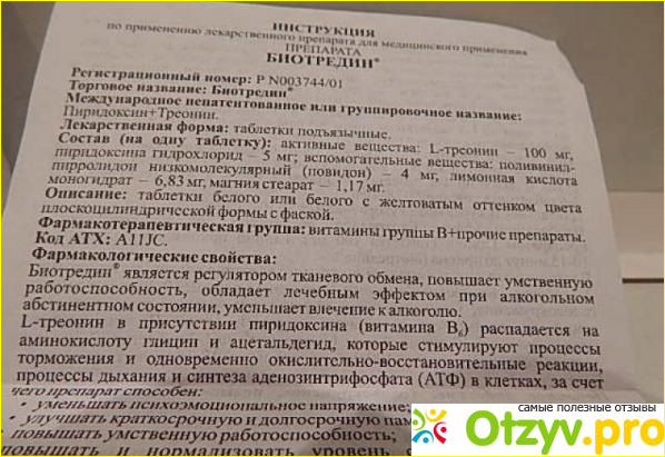 Он указан: L - треонин (это кислота) и витамин B6. Биотредин в совокупности с глицином отлично помогает сосредоточиться при повышенных нагрузках, успокаивает, снимает нервное напряжение, улучшают концентрацию и память и немного повышает работоспособность.