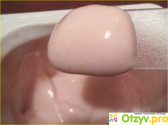 Он не густой, но хорошо держится на ложечке. В этот раз я взяла пластиковую широкую палочку. Так хорошо видна его консистенция.