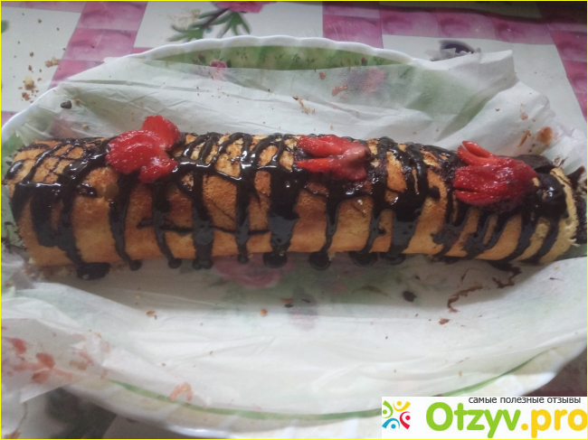 7. Срезаем края бисквитного рулета. Украшаем растопленной глазурью либо шоколадом и клубникой.