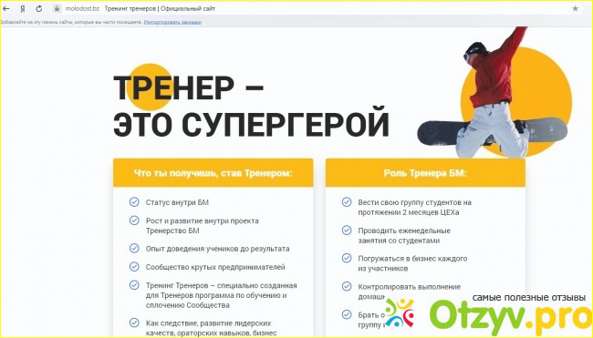 Очень важный и такой типичный раздел это "Отзывы". Тут есть информация от участников курсов, тренингов, мастер-классов, вебинаров. Люди пишут свои имена, род деятельности, делятся впечатлениями. Прочитав их вы сразу сможете понять, действует "Бизнес молодость" или нет. Ведь никакой сайт не даст столько информации сколько мнение людей.