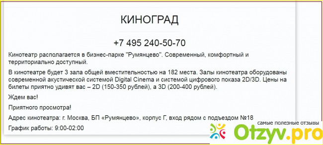 Именно на сайте можно забронировать билет на коносеанс, который проходит в "Кинограде". Там имеется 3 зала на 182 места. Там есть современные системы 2Д и 3Д, а также система Digital Cinema.