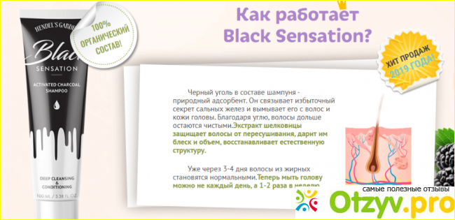 Black Sensation – специальный лечебный шампунь на основе активированного угля. Его разработала и выпускает компания Хендель. Это российских бренд, который специализируется на натуральной косметике и БАДам. Достаточно известный. Поэтому качество шампуня хорошее.