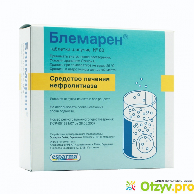 Лекарство - шипучие таблетки Блемарен - назначаются при заболеваниях почек и мочевыделительной системы для того, чтобы растворять образовавшиеся там соли, превратившиеся в конкременты (камни).