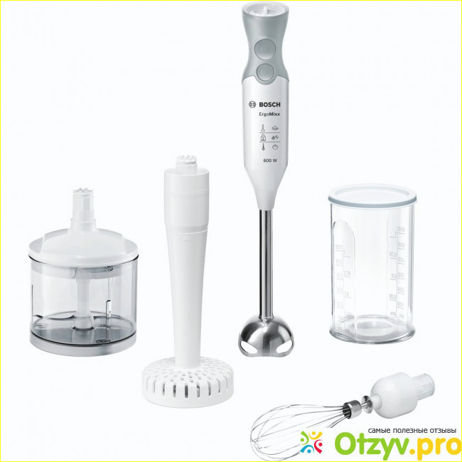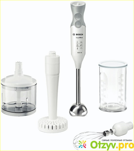 В комплекте имеется 4 насадки: измельчитель, насадка для приготовления пюре, венчик для взбивания и насадка для приготовления картофельного пюре. Также в комплекте чаша с крышкой, объемом 600 мл.