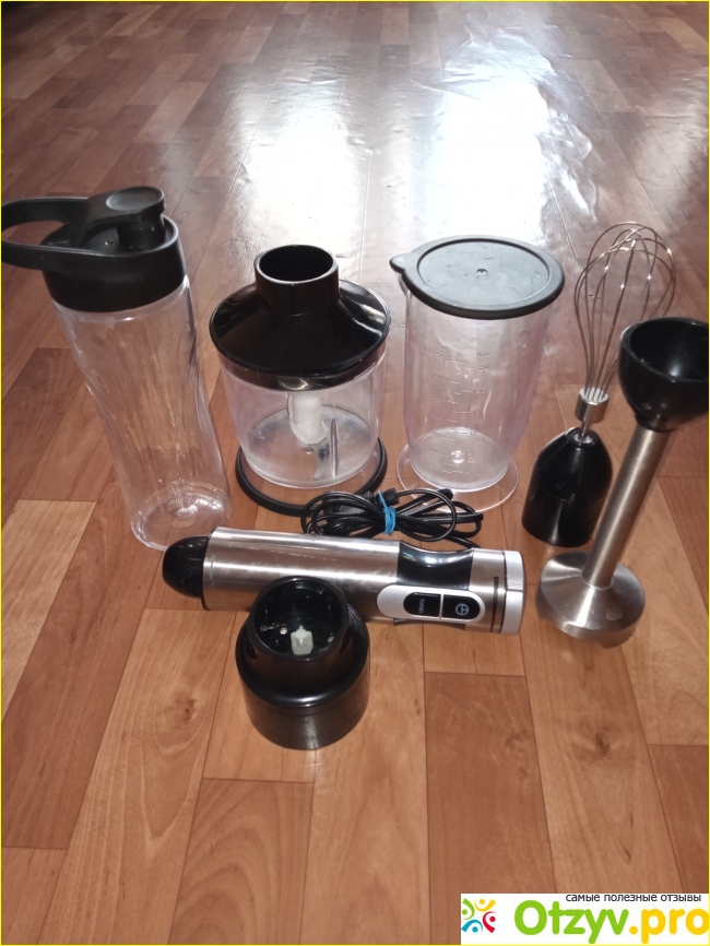 Измельчитель с мерной емкостью, погружная часть блендера из прочного металла, в мерном стакане можно взбивать и замешивать тесто, венчик, сам моторный блок, ножевой блок и мерный стакан для измельчения и приготовления коктейля, смузи.