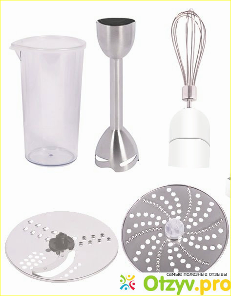Емкость блендера 1500 мл, мощность устройства 600 Вт, вполне приличные параметры для такого уровня прибора. Материал погружной части выполнен из нержавеющей стали, сам корпус пластиковый, есть плавная регулировка скоростей, измельчитель, диски для нарезки ломтиками, терка, венчик для сбивания, турборежим и многое другое.