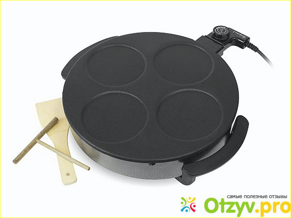 Диаметр рабочей поверхности блинницы 30 см, поверхность имеет антипригарное покрытие ( в виду этого в тесто для блинов нет необходимости добавлять масло) и термостойкий аллюминиевый корпус. По бокам расположены удобные ручки для транспортировки блинницы. Так как корпус термоустойчив, то им невозможно обжечься. Имеется съемный шнур, но к сожалению нет специального отсека для его хранения.