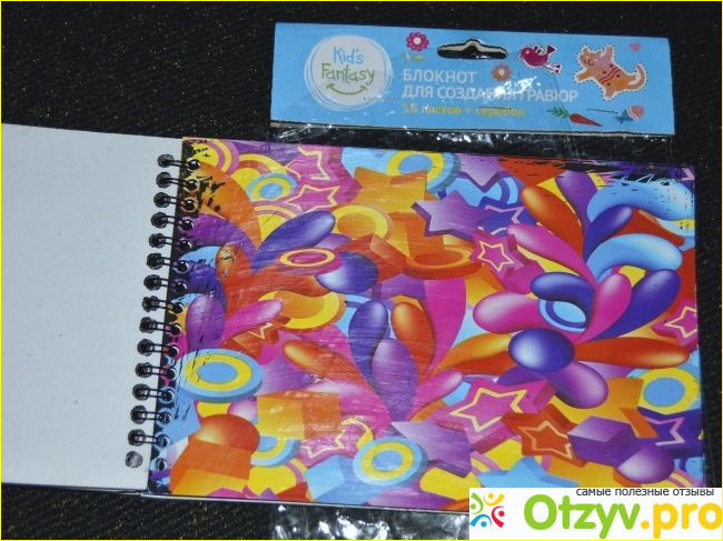 Блокнот – это 16 картонных листов на спирали. Основание цветное и имеет разные странные рисунки. В одном блокноте они одинаковые. На обороте есть фото этого рисунка, а также картинки с забавными зверушками. В комплект идёт скребок, очень напоминающий карандаш. Обработан он хорошо, не острый. Тыльная сторона мне не понравилась. Как-то топорно её отрубали. Фото скребка, к сожалению, нет, сделать не успела, а его уже потеряли. Работать им удобно, будто рисуешь. Только откорректировать рисунок невозможно. И линии получаются цветные, в зависимости от того, что проступает снизу.
