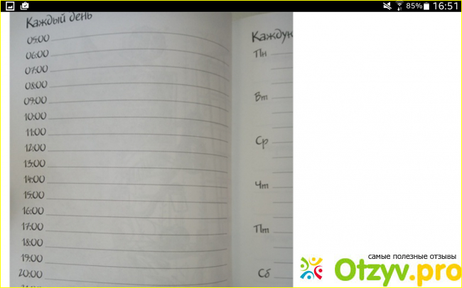 Знаете, что самое первое бросается в глаза? В данном блокноте очень белые, плотные и прятные на ощупь страницы. Их хочется заполнять сразу аккуратно, красивым почерком, а кто умеет, с вензелями и прочими прелестями. Блокнот снабдили в общем типовыми страничками с расписанием на день по часам и на неделю по дням.