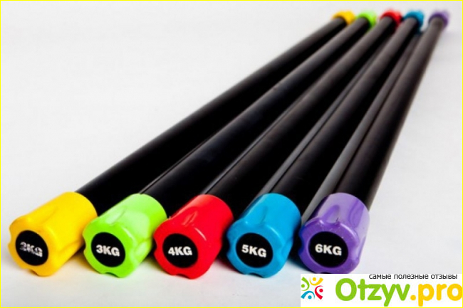Также они есть разного размера и веса. Каждый бодибар в основном черного цвета а на конце есть маркировка разного цвета. Эта цветная маркировка означает вес. Есть по 3, по 5, по 10 и так далее килограмм.