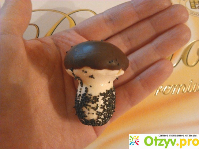 На годовщину свадьбы свекровь подарила нам коробочку конфет ручной работы. Я посмотрела на производителя и немного расстроилась, подумала, что конфетки будут невкусными. Но я ошиблась. Коробка приятная на внешний вид, сделана в жёлто-золотых тонах, подарить такую можно без стеснения. В коробке 18 конфет массой 400г в форме грибов. Ножка у грибов обсыпана маком, а шляпка - в шоколаде. Сами конфеты представляют собой нежное суфле. Надо сказать, что шоколад тает во рту, посторонних привкусов не имеет, суфле вкусное, нежное, с запахом сливок. Я была приятно удивлена этими конфетами и фабрикой Акконд.
