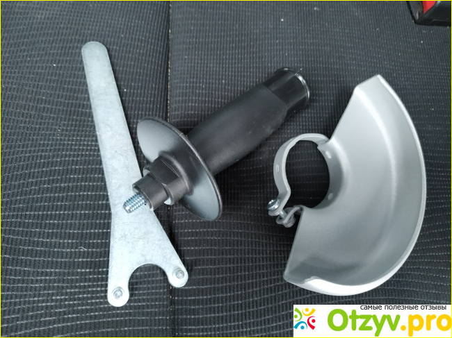 Защитный кожух поворотный, закрепляется на корпусе болгарки с помощью болта на м6. Дополнительная рукоятка простая, без виброзащиты, может прикручиваться к редуктору через 180 градусов.