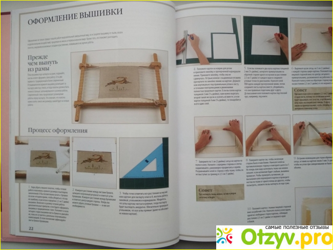 Издание объемное. Содержание на много страниц, причем иллюстраций примерно поровну с текстом. Рассмотрев оглавление понимаешь, насколько все четко структурировано и сколько интересных открытий можно ожидать в процессе чтения. Якобинская вышивка, шелковая гладь, блэкворк, работа по канве и многое другое рассматриваются начиная с истоков и исторических справок и заканчиваются предложениями провести подобную работу своими руками.
