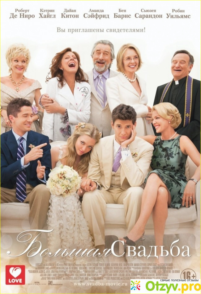 Помню как в 2013 году намечалась премьера фильма как раз с комедийным жанром, назывался он "Большая свадьба". Как раз моя тематика, так как нравится смотреть на свадьбы. Долго ждала этой премьеры, сразу же надеялась, что не разочаруюсь, потому что в фильме собрали звездный состав. Здесь снимались все мои любимые актеры, а именно Роберт Де Ниро, Дайан Китон, Кэтрин Хайгл, Сьюзен Сарандон, Бен Барнс и Аманда Сайфред, так что очень хотелось сходить на премьеру фильма в кинотеатр. Рейтинги у этого фильма были тогда не самые хорошие, то есть по шкале в 10 баллов его критики оценили всего лишь в 6, но это не помешало мне его посмотреть. Кстати, об этом я не пожалела, фильм затягивает своим сюжетом, очень интересная, хоть и довольно предсказуемая концовка.