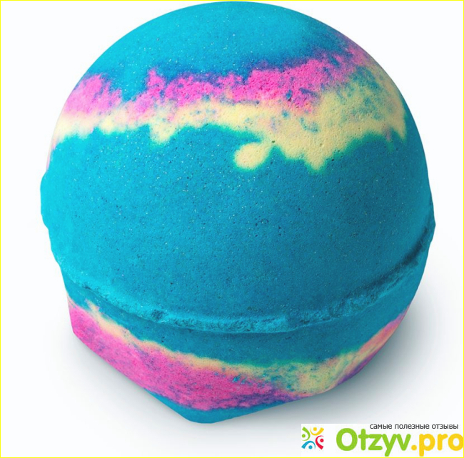 Сама бомбочка просто была в бумажном пакете, какой-то пластиковой плеточки на ней не было, так она и продается. Внешне она имеет круглую форму, очень красивого цвета, словно какая-то планета. В основном цвет ее как цвет моря, но там есть немного желтого и розового. Смотрится она конечно красиво. Размер бомбочки достаточно большой, тяжеленькая.