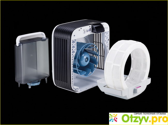 Прибор не очень большой, красивого дизайна с баком для воды на десять литров (воды хватает на сутки), может обслуживать площадь в сто квадратов, пыль оседает в резервуар с водой.