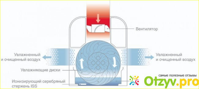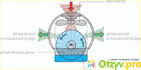 Boneco W1355A мойка воздуха устроена очень просто: в пластиковом (пищевой) ведре установлен вентилятор, резервуар для воды, увлажняющие диски и поддон для воды - на выходе увлажненный и очищенный воздух.